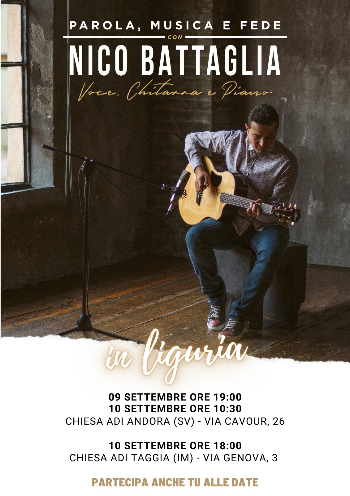Alcune note biografiche di Nico Battaglia: cantante, musicista, worship leader, autore/compositore, produttore, classe ’80, nato a Trani, città del nord barese. Da giovanissimo inizia nel 1995 a coltivare il suo talento musicale collaborando con la sua chiesa e con diversi artisti cristiani in veste di chitarrista e cantante, attività che non ha mai interrotto nonostante le dure prove che ha dovuto superare.